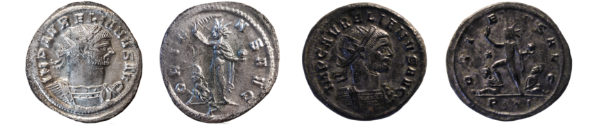 Depicting Eastern captives with the legend ORIENS AVG, the double-meaning is that the Romans are rising supreme over the East, and that the sun is rising, heralding “a new day” after recent eastern conflicts.