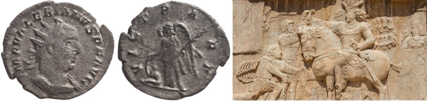 In the year 257, Valerian I struck a rare silver Antoninianus depicting the Roman deity Victory looming over a seated Parthian captive. Three years later, in 260, Valerian would make history as only Roman Emperor to himself be taken captive. It was by Shapur I, Sasanian King in Persia, whose empire had succeeded the Parthian.
