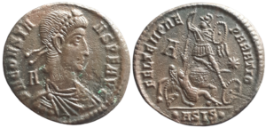 Obverse: D N CONSTANS P F AVG. Diademed, draped and cuirassed bust right; A behind.