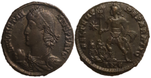 Constantius II’s father Constantine was famously the first Christian Emperor of Rome. But the popularity and political supremacy of the new religion were not yet achieved. Over time, though, the Byzantine concept of the “barbarian” came to connote not only an uncivilized foreigner, but a religious outsider, especially Pagan. Here we see that process taking shape in the visual medium of coinage.