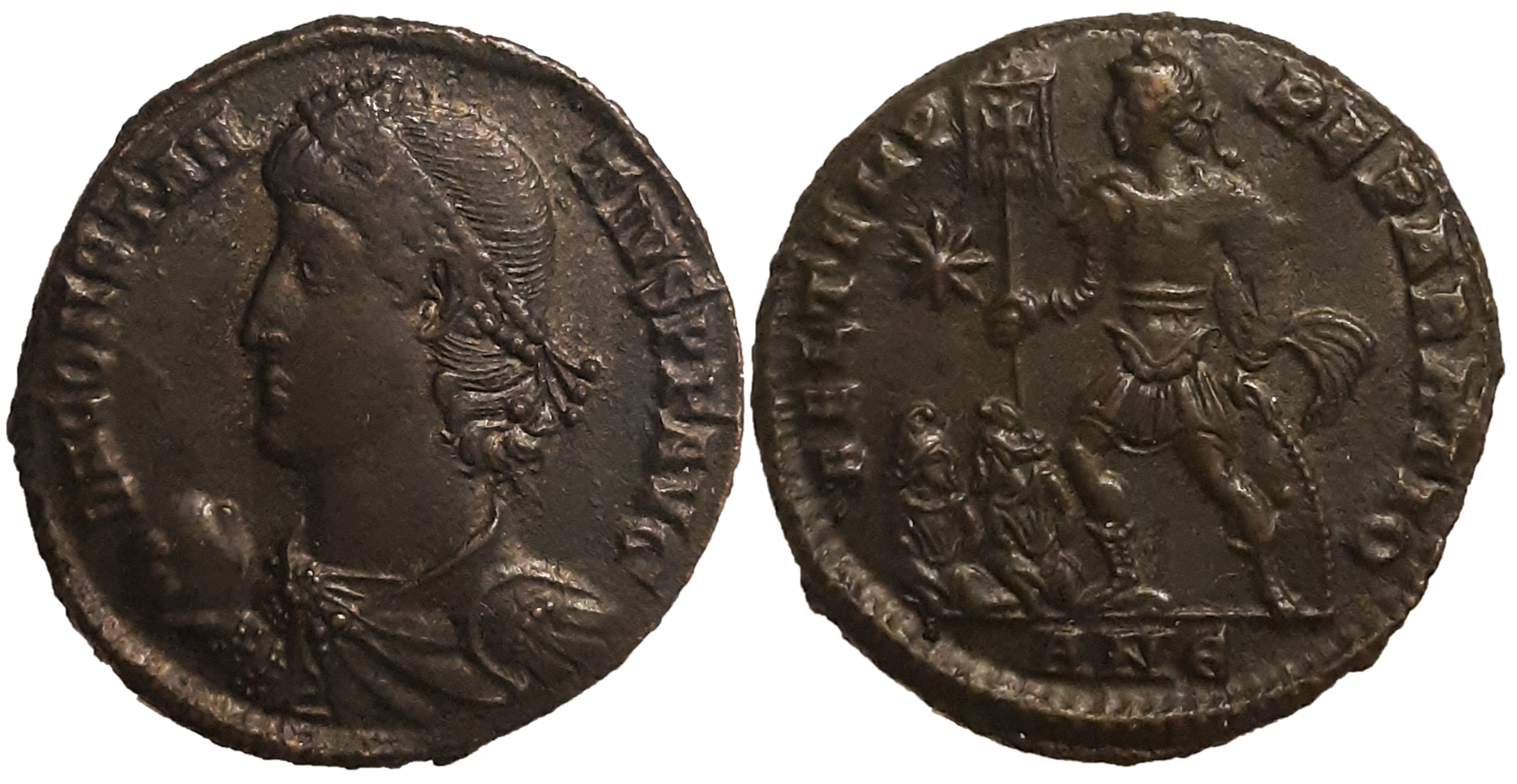Reverse: FEL TEMP REPARATIO / Star (left) / ANЄ (exergue). Constantius II in military garb standing left, spurning a captive with foot while holding standard, a cross decorating its banner, and resting hand on shield set on ground. To left, two bearded captives kneeling vis-à-vis, wearing Phrygian caps, hands bound behind their backs.