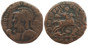 Reverse: VIRTVS AV-GG ET CAESS NN // AQP in exergue. Galerius on horseback right, holding round shield and spearing fallen enemy to lower right; another fallen enemy to lower left.