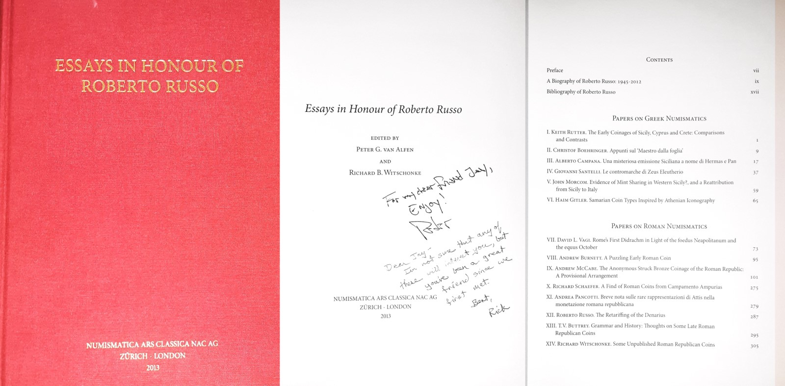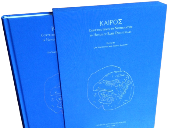 Among the unsigned volumes are Overbeck & Meshorer (1994), Das Helige Land… (shown with a coin of mine on my Eastern Greek page) and Wartenberg et al. (2015), ΚΑΙΡΟΣ: Contributions to Numismatics in Honor of Basil Demetriadi (numbered copy 32 of 200).