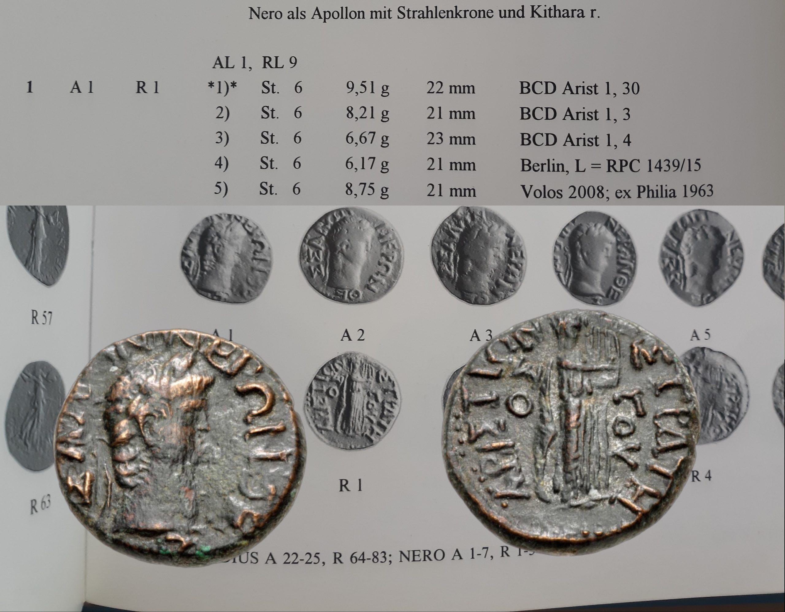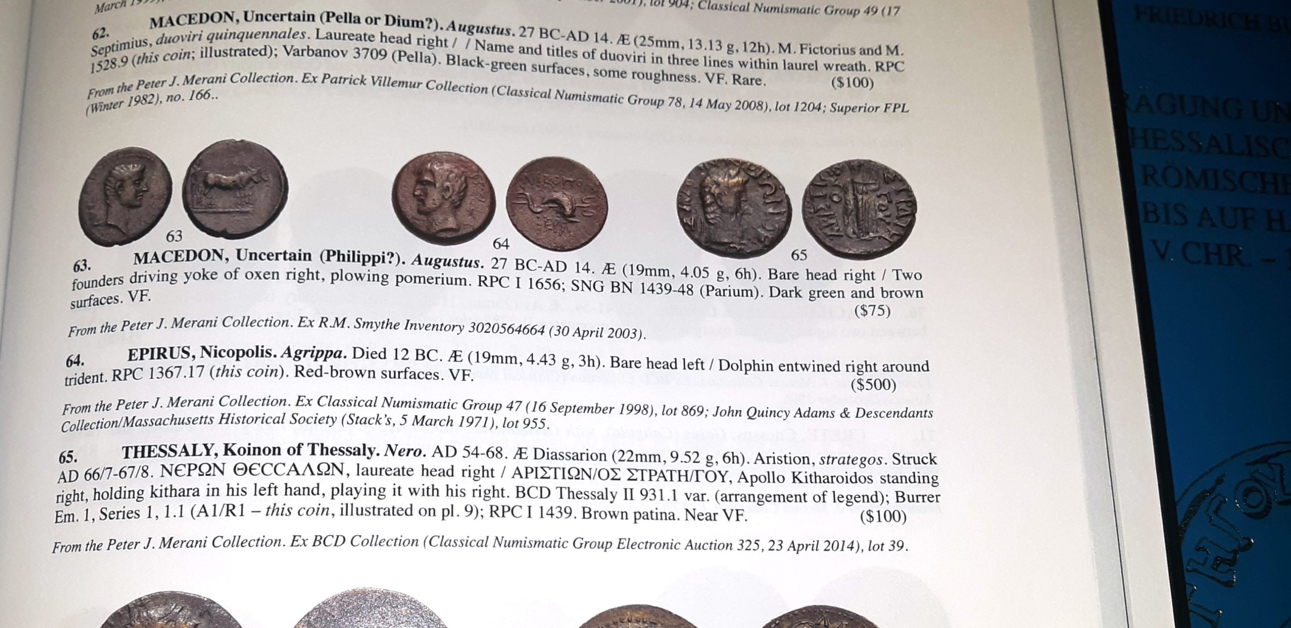 ![]() Nero “Plate Coin.” Background: Burrer’s description & photos of Obv (A1) & Rev (R1) 1. Coins: Nero Bronze from the Koinon of Thessaly, ex Merani Collection (part II, 65) and CNG EA 325, “Coinage of the Thessalian League from the BCD Collection” (Lot 39), illustrated in Burrer (1993: 1.1, pl. 9, A1/R1), referenced in RPC Supplement 1, 1439 & RPC Online (as Burrer 146: 1.1); ![]() 2. Book: Burrer, Friedrich. 1993. Münzprägung und Geschichte des Thessalischen Bundes in der Römischen Kaiserzeit bis auf Hadrian (31 v. Chr.-138 n. Chr.). Saarbrücken: Saarbrücker Verlag. Hardcover copy Ex Library of Hermann Lanz (1910-1998) & Hubert Lanz (of Numismatik Lanz, the firm that cataloged the first two BCD sales of Corinth [Lanz 105, 2001] & Euboia [Lanz 111, 2002]). 3. Catalog: CNG. 2021. Nvmmis Historiam Discens: The Peter J. Merani Collection. Lancaster, PA: Classical Numismatic Group. [ANS – DONUM record.] One of a reported 50 hardcover copies, including Parts I – III of the Merani collection (sold 2021). As illustrated in CNG volume, Nvmmis Historiam Discens: The Peter J Merani Collection 4. Comparanda: Two more from the same sale of “Coinage of the Thessalian League from the BCD Collection”; Plus a Claudius Legionary AE As from Patrae, also from both BCD and Merani Collections, accompanied by my catalog of CNG 81.2 (20 May 2009), where the coin was published as BCD Peloponnesos II 2782. |