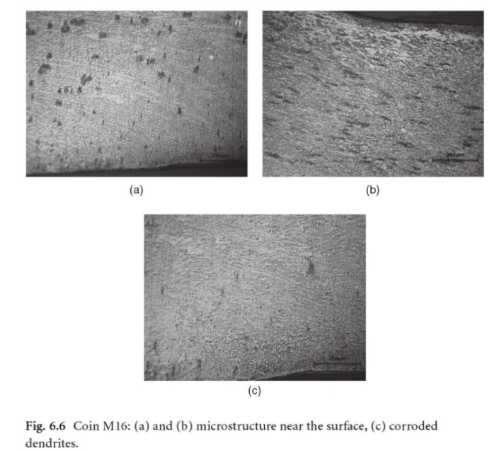 Of the 35 cataloged by Harlan J. Berk, Ltd. (prob. by Curtis Clay?), 23 had tiny holes drilled in the edge; another 12 were “quartered,” including my pair. The purpose of cutting the coins was to “look inside” at metallurgical “structures” at various depths (see microscopy images below). All the coins were given ID numbers for the dataset (results & photos/details of each can be examined online) and published texts.