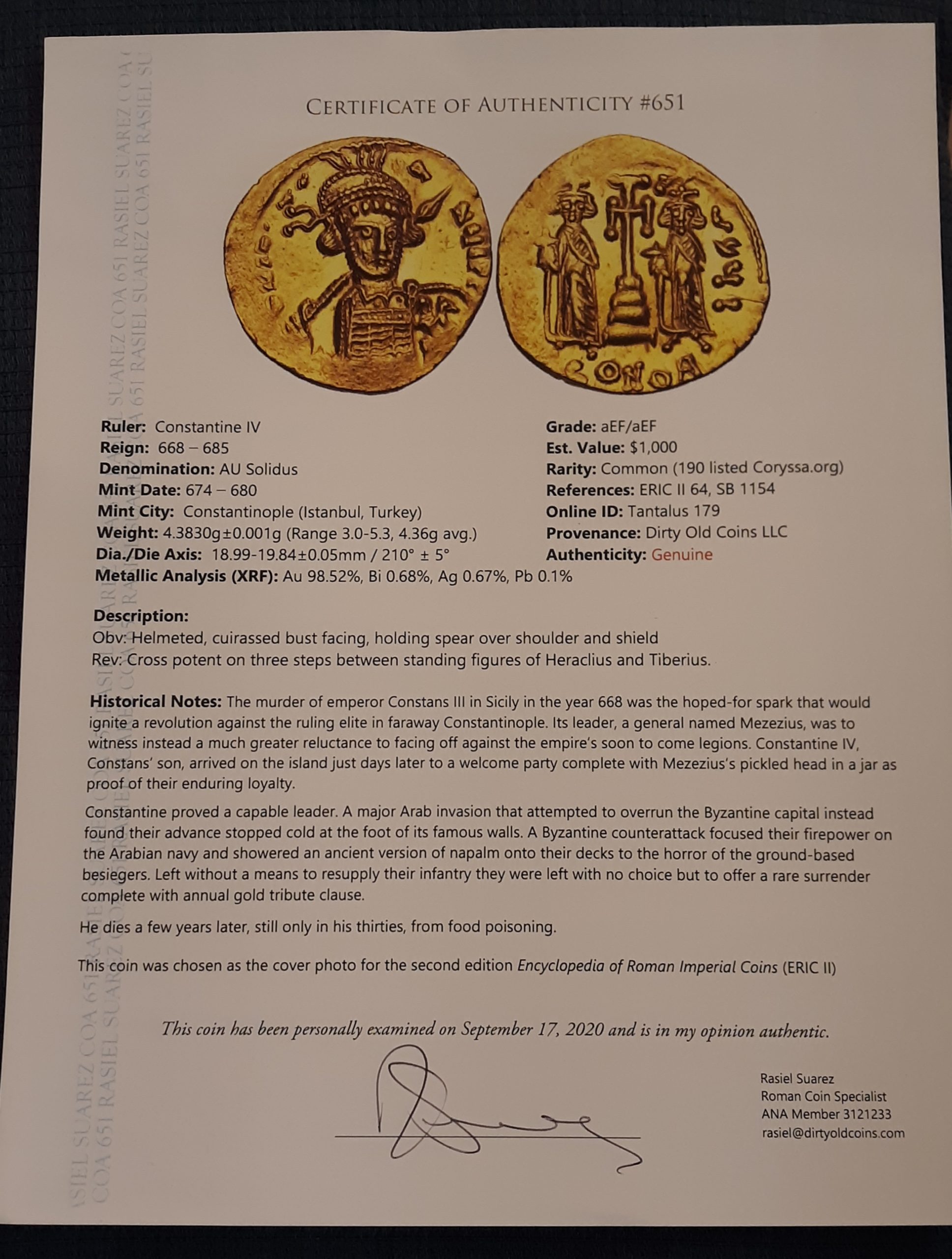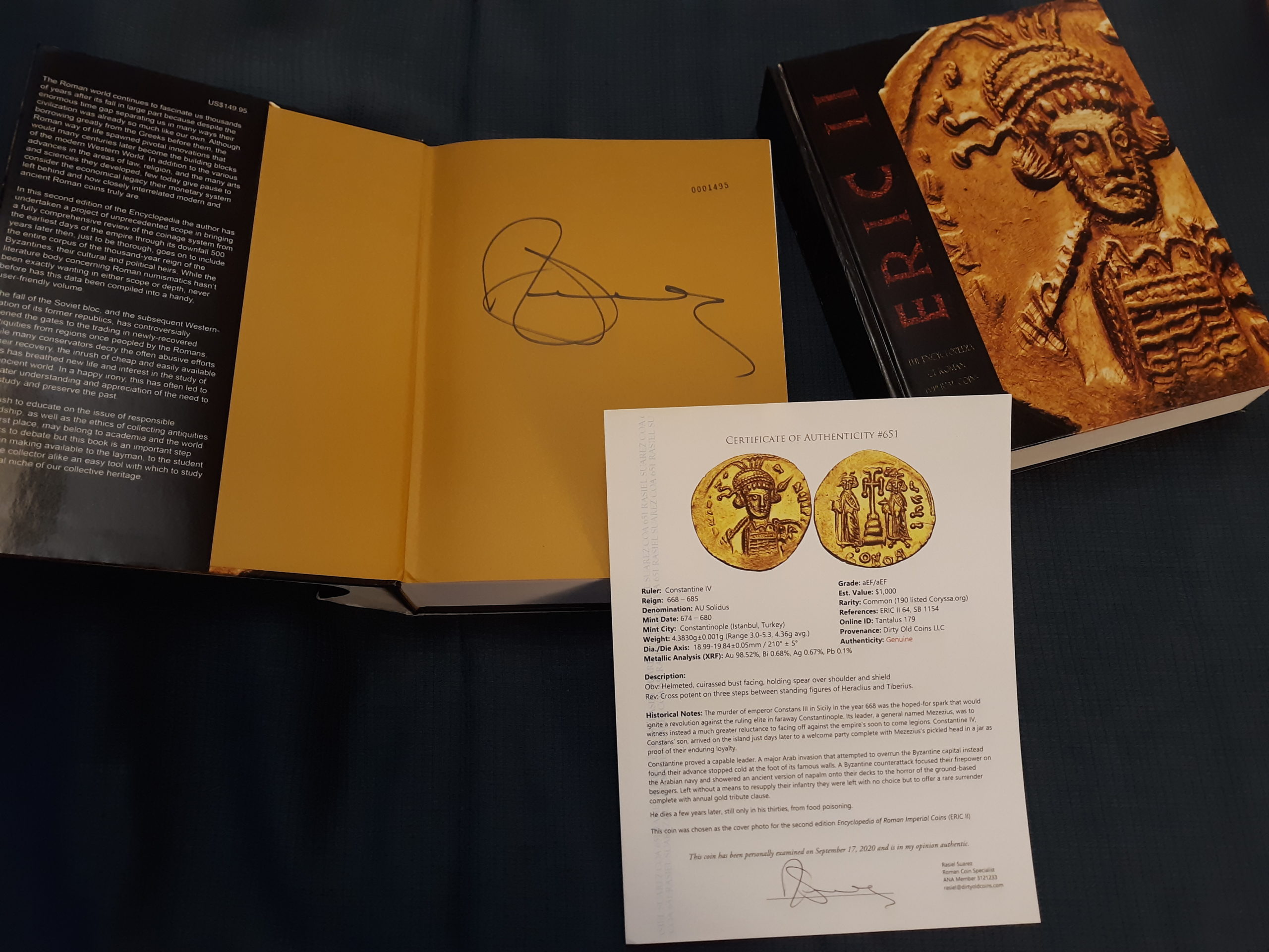 1. Coin: Constantine IV Pogonatus AV Solidus, Ex-Rasiel Suarez Collection (author of ERIC and ERIC II, among others), description & full provenance; ![]() 2. Book: ERIC II (The Encyclopedia of Roman Imperial Coins, 2nd ed., 2010), numbered copy 1495, signed by the author, Rasiel Suarez;