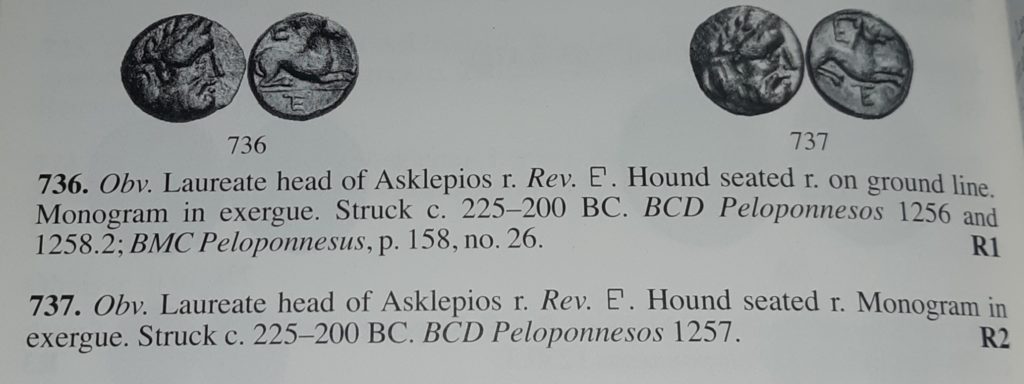 (Incidentally, like my pair, the two Epidaurous dogs illustrated in HGC were also cataloged by ASW and [like one of mine] ex BCD Collection! See yet another pair from the BCD Collection in BCD Pelo. II: Lot 2502 [same dies as BCD Pelo. 1256] & 2503 [same dies as BCD Pelo. 1257]. Both of my rev. dies are different, but all six may have used the same obv. die. BCD Pelo. II contains a third, Lot 2504 –an interesting & unusual variant w/ dies I hadn’t seen before.)