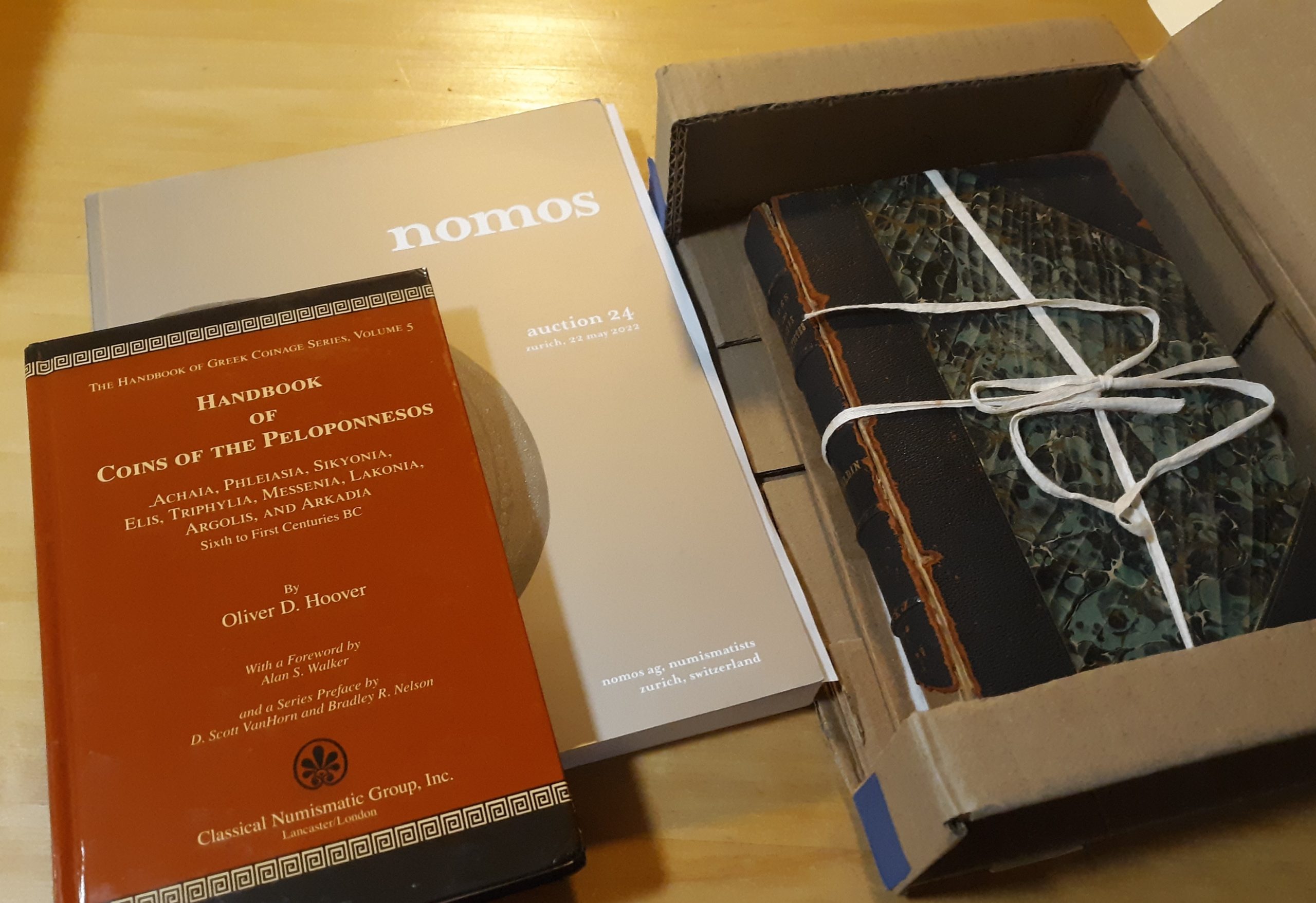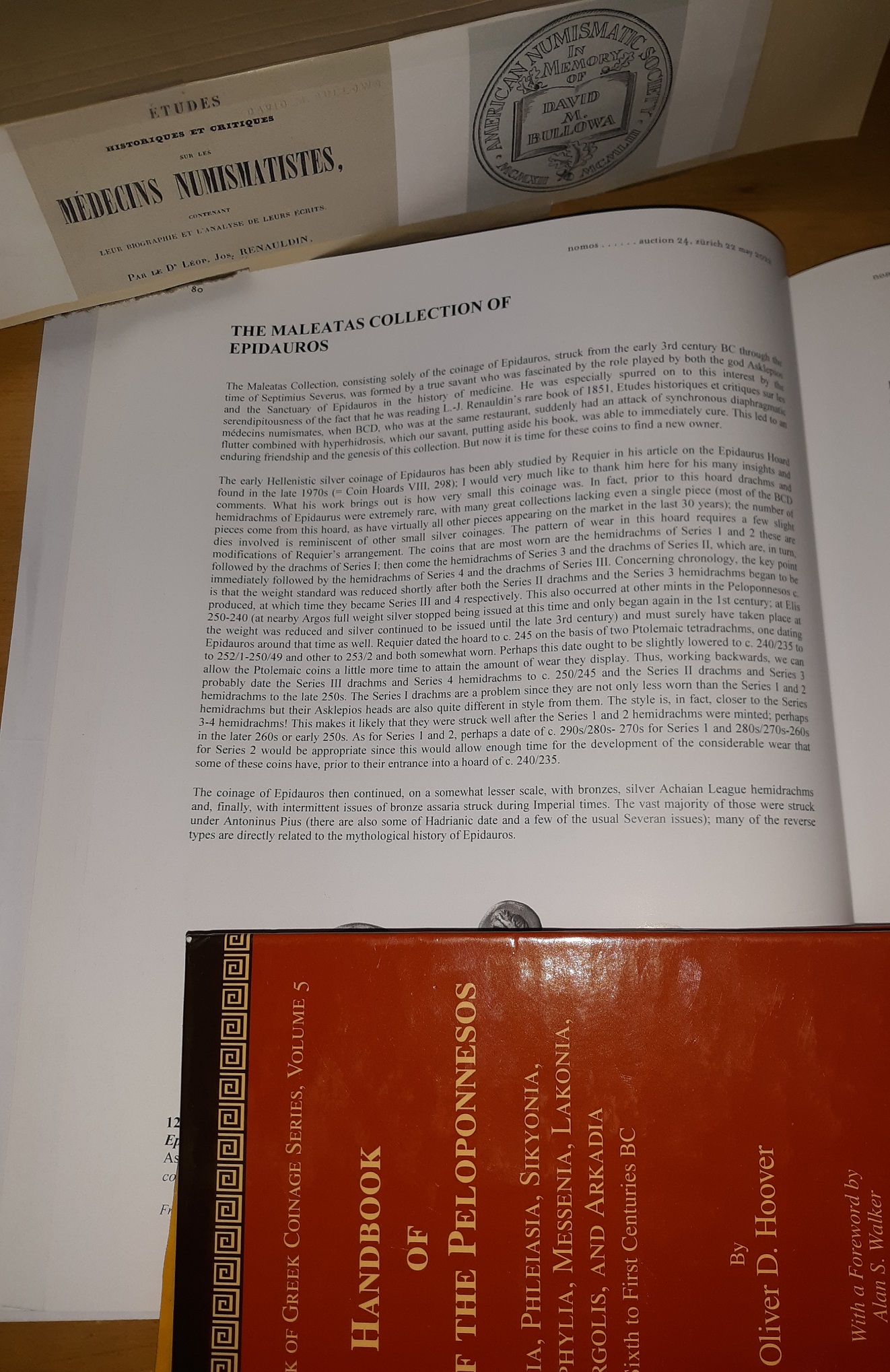 2. Book: Renauldin, Léopold Joseph. 1851. Études Historiques et Critiques sur Les Médecins Numismatistes, Contenant Leur Biographie et l’Analyse de Leurs Écrits. Ex-ANS Library & David Bullowa (1912-1953) Lib., w/ both of their bookplates and D. Bullowa’s embossed stamps. (David Bullowa died young, but also began his numismatic career young, his first donation to ANS in 1929 at age 17. As David Hill wrote, “Bullowa would remain in close contact with the ANS for the rest of his life, making steady donations to its cabinet and library” [ANS Magazine, 2018 (2): p.46 (pdf)]; likewise, his wife Catherine Bullowa [1919-2017] who survived to 97.) This copy of Renauldin was illustrated in The E-Sylum (19 Sep 2021) Vol 24 (38), Article 2, “ANS Offers Numismatic Literature” (possibly my only “plate book”!). The cover is detached, and the spine & binding fragile, so I use one of the online copies when I want to peruse the text; ![]() I will confess that at the time, I didn’t know why I was buying Renauldin’s obscure 1851 tome on French physician collectors. But I discovered why the following year, upon acquiring a used copy of the Nomos 24 print catalog.… 3. Catalog: Nomos 24, including the “Maleatas Collection” introduction on p. 80 (authored, no doubt, by ASW, who also called the live auction). I was especially excited about the account of how the collection began, as I finally learned my reason for buying Renauldin (i.e., because one day it would fit into my Maleatas-Epidauros-BCD subcollection). The collector was: