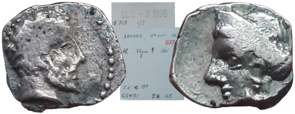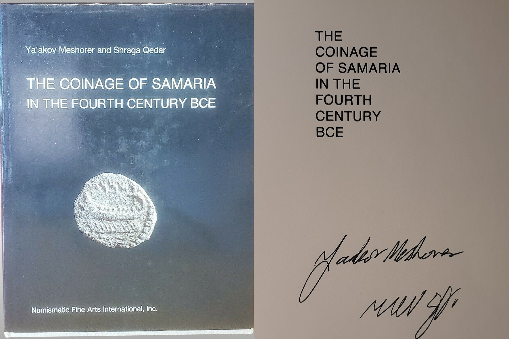 1. Coin & Collector Tags: Samaria AR Obol or or “Ma’eh,” description & full provenance (in my FORVM Gallery), w/ tag from coll. Dr. Jay M. Galst (1950-2020), indicating past publications & provenance to Stack’s (3 December 1996), lot 708 (part of), the provenance to Samaria Hoard & Athena Fund already lost;![]() * Please note: CNG sold many Samarian coins ex-Galst in the past year-plus; I’ve found many of those to have lost provenances to Samaria Hoard &/or Athena Fund (some were preserved, yet others were unrelated to S.H. & A.F.); if you have any of those coins, I urge you to check the refs. or contact me with your lot numbers & I’ll check my volumes; 2. Book: Yakhov Meshorer & Shraga Qedar. 1991. The Coinage of Samaria in the Fourth Century BCE. Los Angeles: NFA Intl. Copy signed by author, Meshorer (in English & Hebrew), ex-ANS Library Duplicates (no bookplate); the volume that first published the Samaria Hoard (CH 9·413 Samaria, before 1990, No. 165=this coin) & the primary ref. on Samarian coinage until the same authors published Samarian Coinage in 1999;