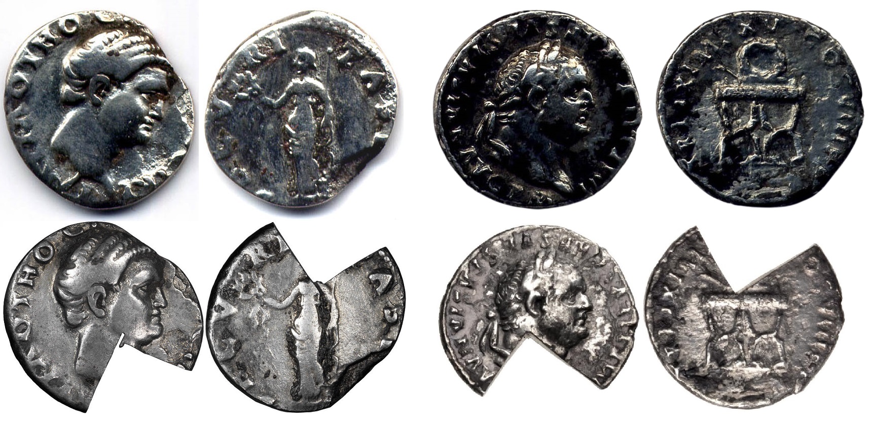 4. Comparanda: Pair of denarii (Titus & Otho ex-Jyrki Muona) subjected to “destructive analysis” of interior composition, cross-sections illustrated in Butcher & Ponting. The Otho is “M16” (for Muona); the Titus, “M40.” Their respective “silver bullion” contents were measured at 98.52% and 78.76% (nearly a 15-fold increase in non-silver content within barely a decade!). A few years later, Domitian would (temporarily) restore the denarius to previous levels.
