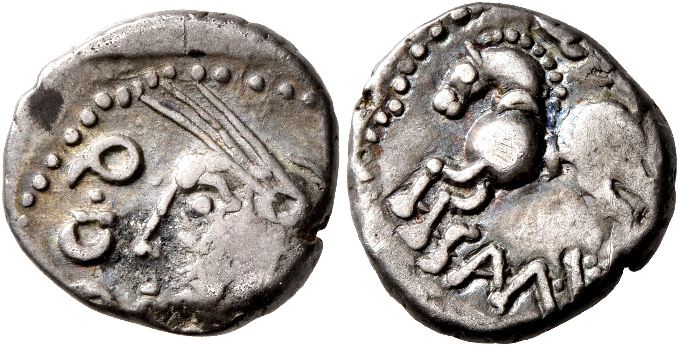 Obv: Q•DOCI, Celticized head of Roma left.
