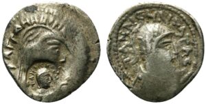 Reference: Senior 197.1D. Cf. Alram 1269A (corr., CM: “Tanlesm”); MIG 608 (corr., CM: “Otannes”) & Mitchiner ACW pp. 130-1, 759-761 (same), 758 (without CM; Herat, 85-78 BCE).