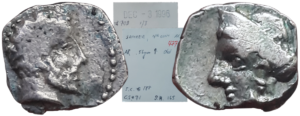 Notes: Coin in hand video (LINK). This coin was the first of its type published (first in Meshorer & Qedar’s 1991 The Coinage of Samaria in the Fourth Century BCE). A second was sold by Sternberg in 1994 (later acc. into Israel Mus., 2013). These remained the only known specimens when Meshorer & Qedar’s updated 1999 volume on Samarian Coinage was published. Before that time Samarian coinage was largely an uncharted area, but has grown exponentially. By 2019, Wyssmann was able to catalog at least 11 known specimens, the remained only published since 2010.
