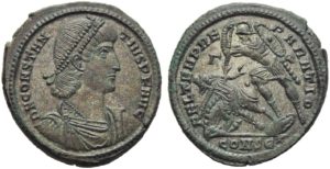 Finally, at a monstrous weight of 10.61g (!), there is “The Constantius II Piefort,” published in 1997 in a Frank Kovacs sale catalog (Kovacs FPL 29, No. 69). Lest one suspect he mistyped, he specifically commented that the weight was extraordinary (“normal weight is 5.20g”) and joked that it was a “Billon centenionalis piefort!” (See also comments on BCE Collection page including my photos of the catalog.)